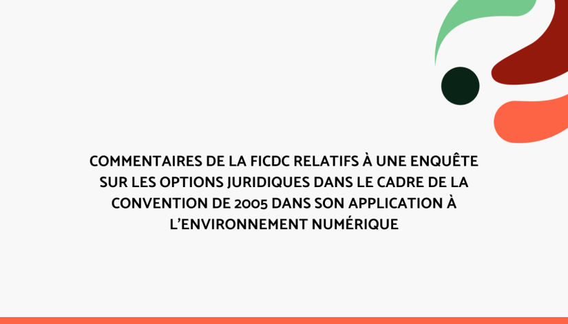 La FICDC a soumis un mémoire à l’UNESCO afin de proposer des éléments d’analyse du cadre juridique international pertinents pour une réponse à une enquête sur les options juridiques dans le cadre de la Convention de 2005 sur la protection et la promotion de la diversité des expressions culturelles qui seraient susceptibles de traiter différentes questions relatives à l’environnement numérique. L’enquête est menée dans le cadre de l’approche multipartite demandée par la Conférence des Parties à la Convention dans sa Résolution 10.CP 8.b, adoptée en juin 2025, qui a demandé au Secrétariat de l’UNESCO de poursuivre son analyse sur l’opportunité, les aspects techniques et juridiques d’un protocole additionnel et d’autres options juridiques sur la base d’une approche multipartite, et de présenter son étude préliminaire sur les options réalisables à la dix-neuvième session du Comité en février 2026, pour discussion.
